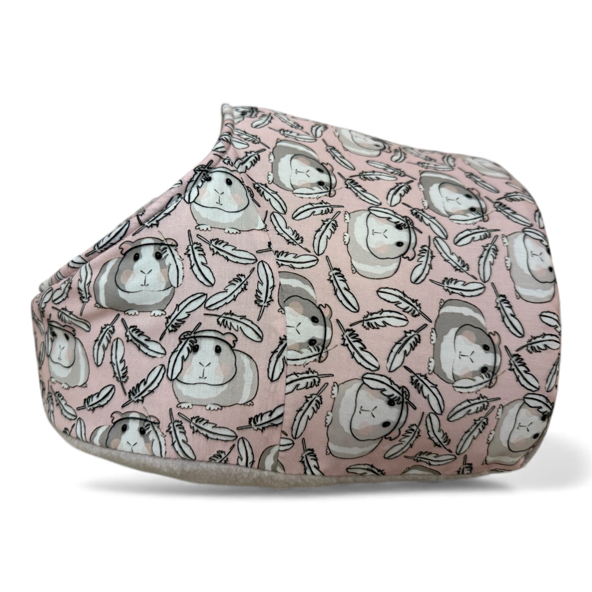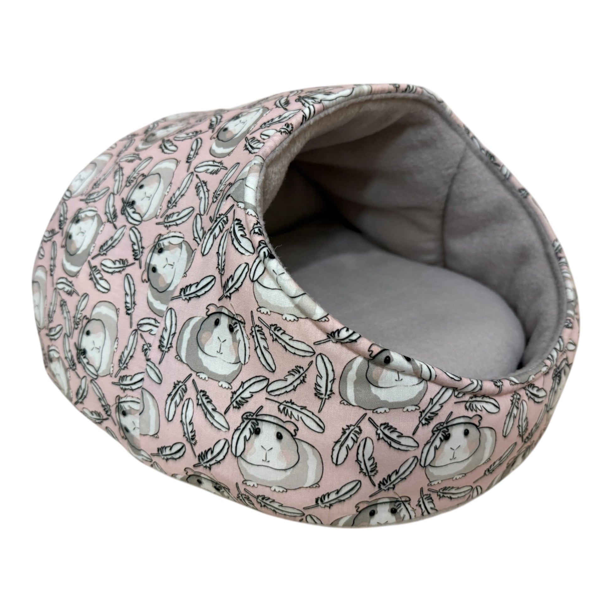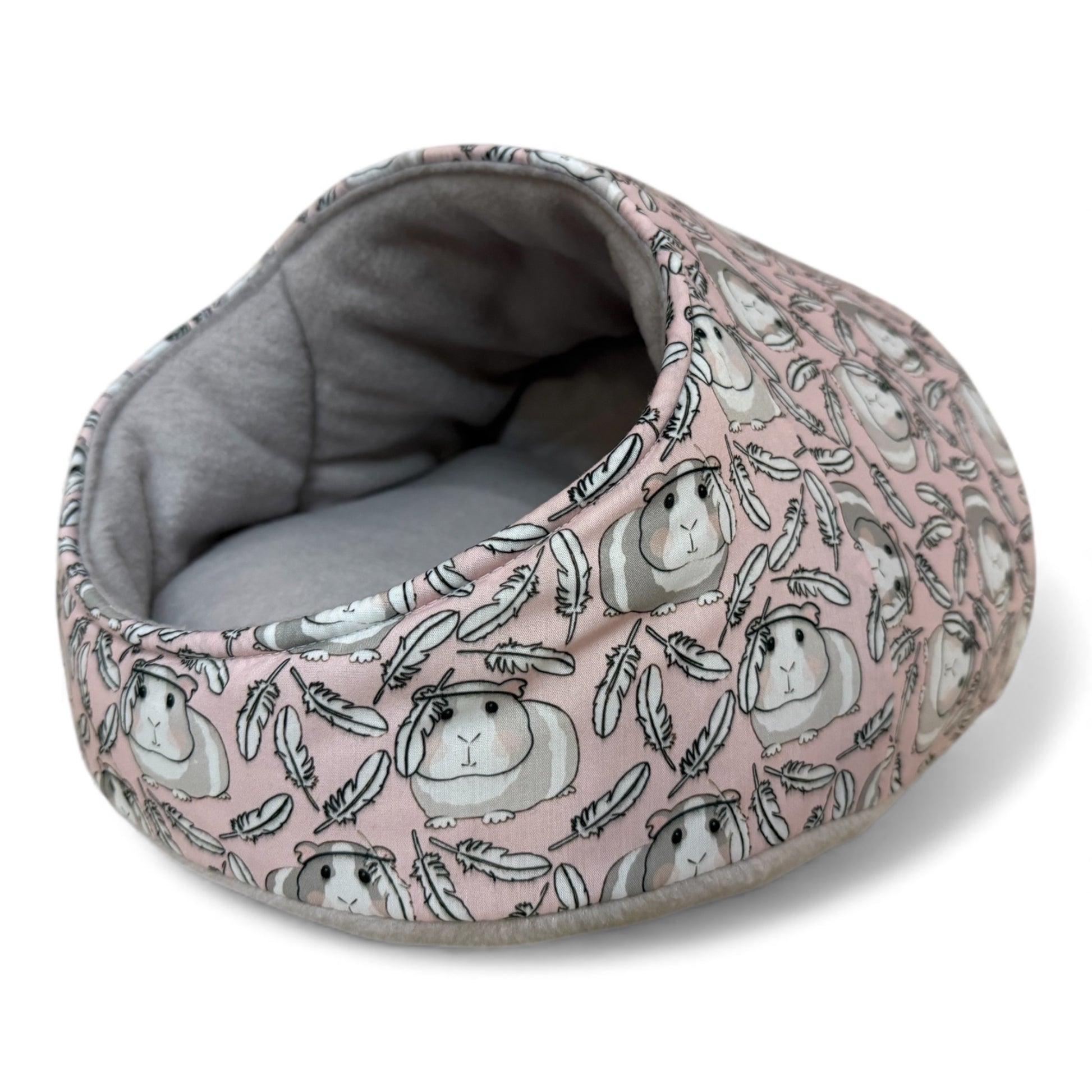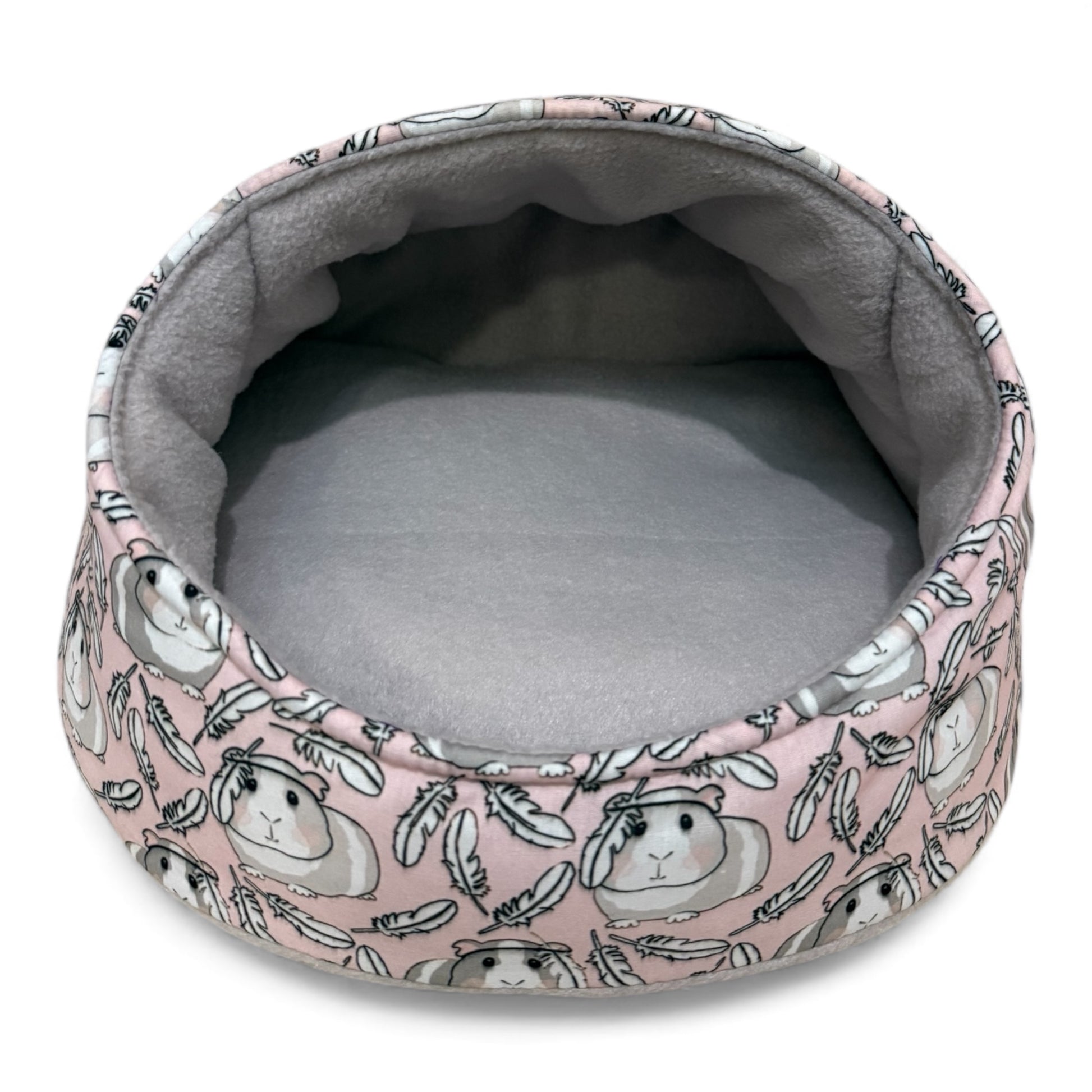 Žaismingas jūrų kiaulyčių raštas su plunksnomis ir pastelinių spalvų vidus kviečia augintinę nusiraminti ir susisukti į švelnų lizdelį.