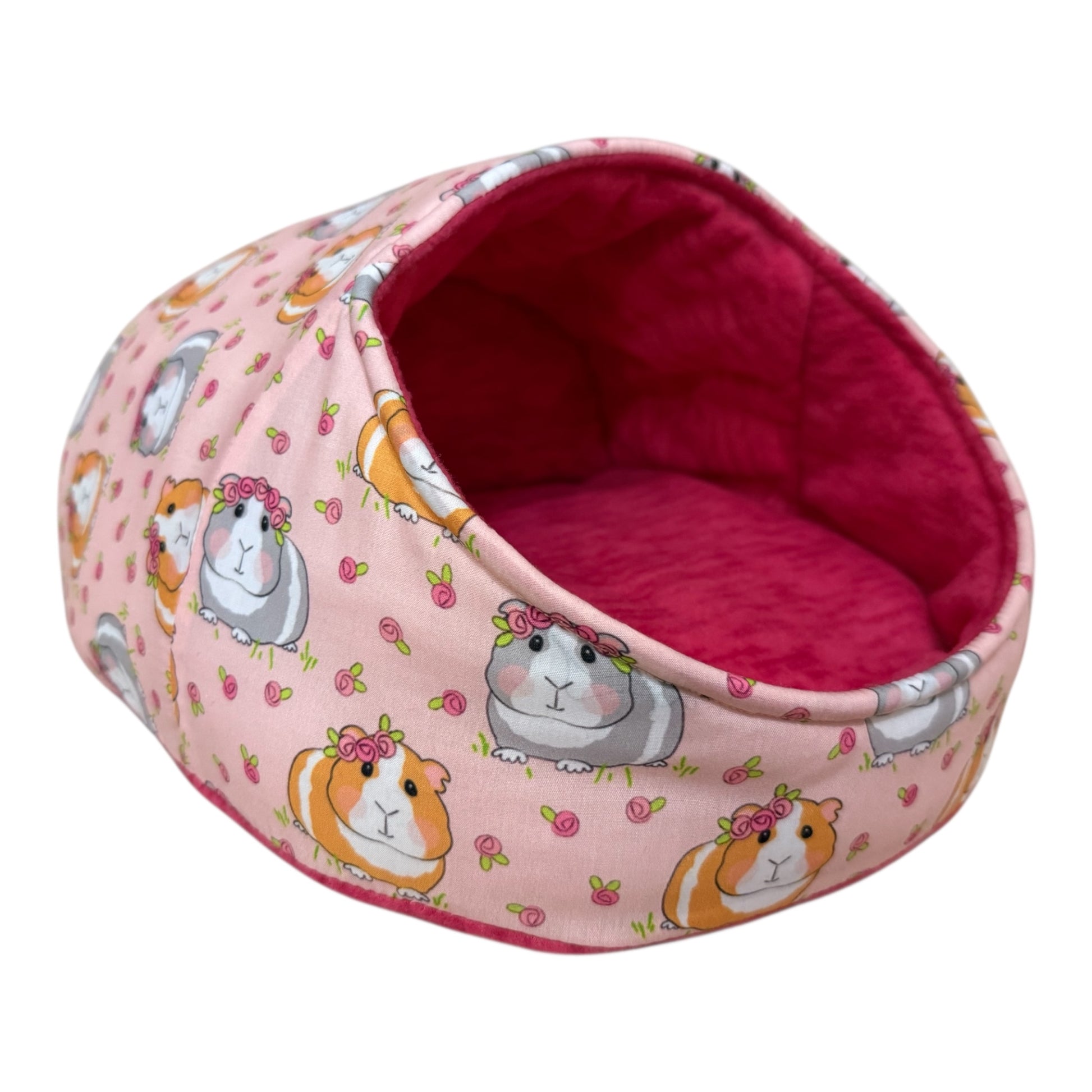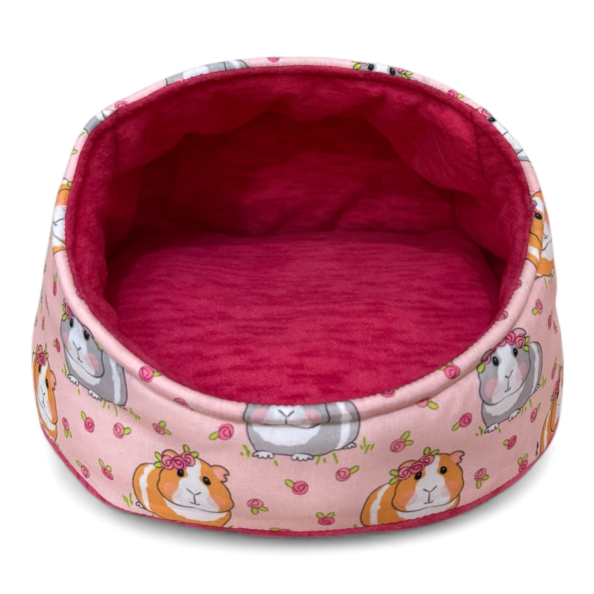Žaismingas jūrų kiaulyčių raštas su rožiniu flisu kviečia augintinę nusiraminti ir susisukti į švelnų lizdelį.