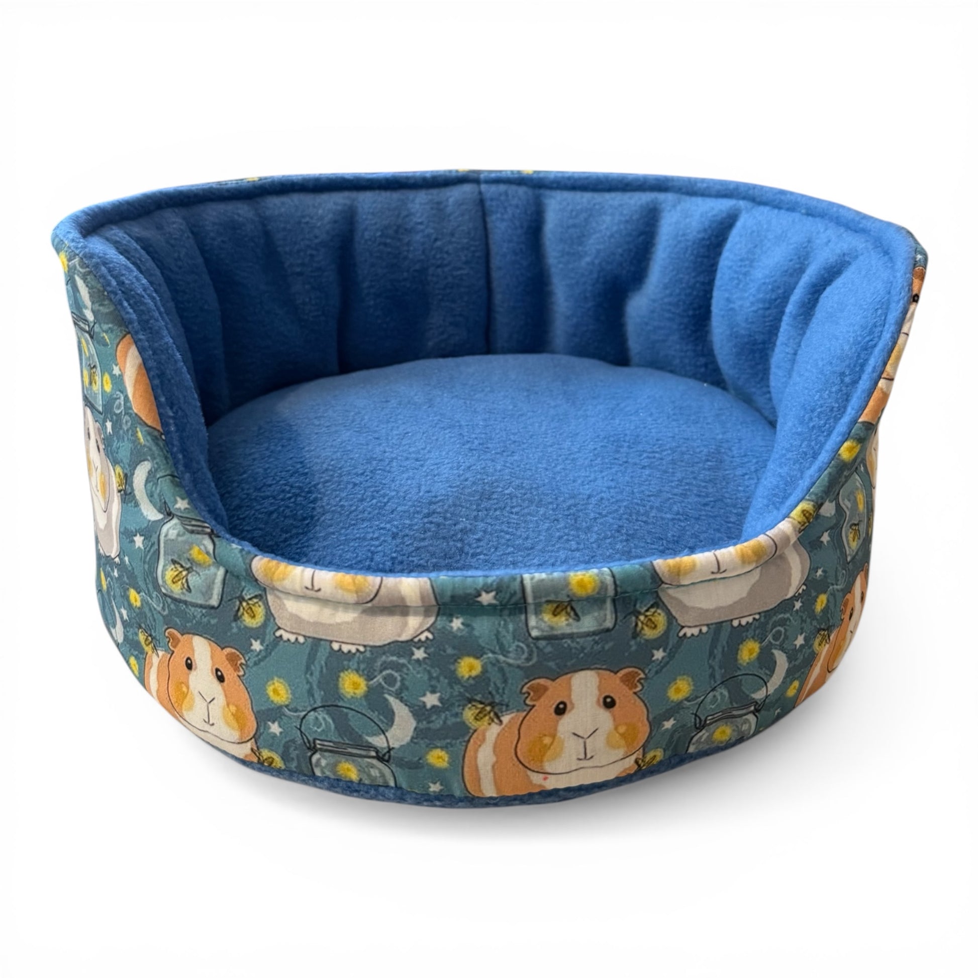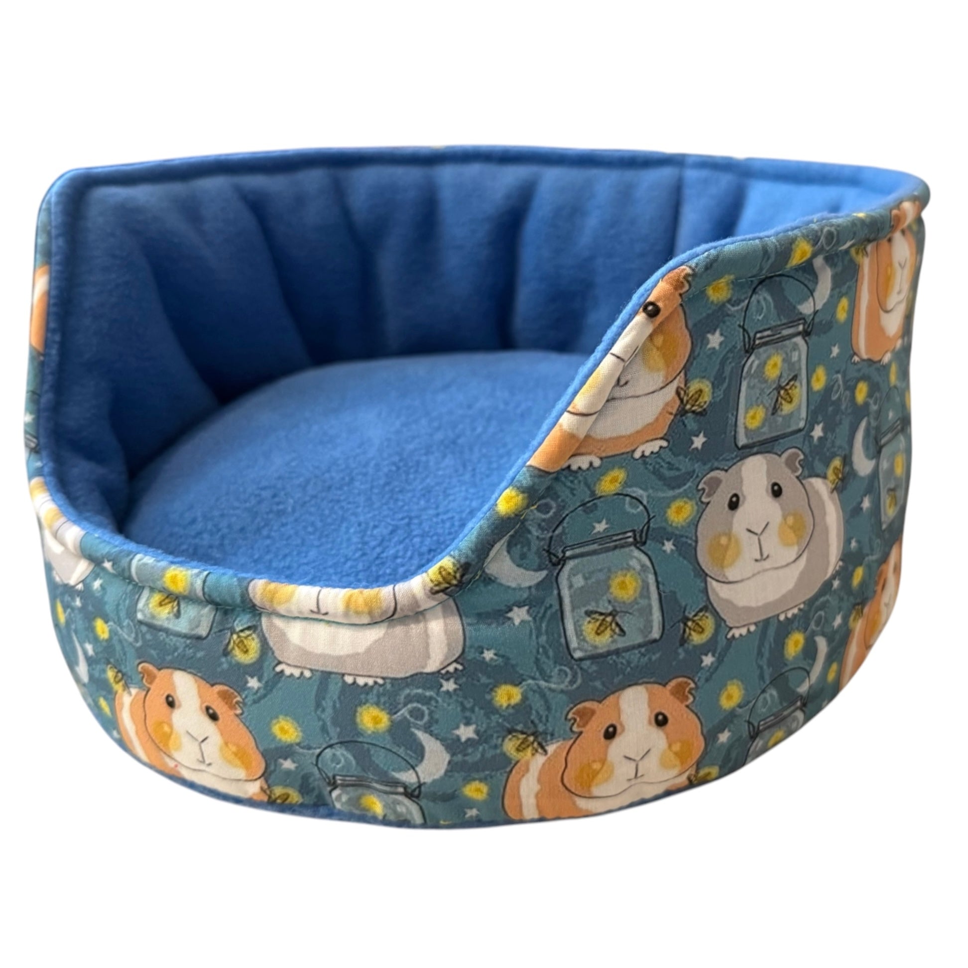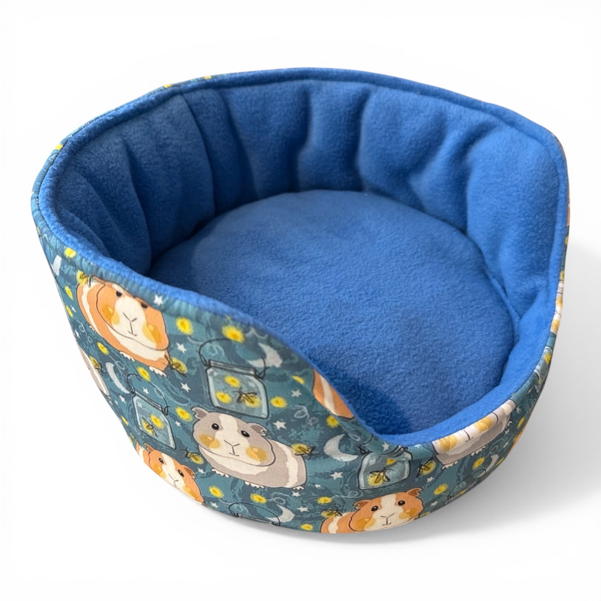 Kutuliukų puodelis – flisinis rankų darbo guolis jūrų kiaulytei, mėlynas su kiaulytėm