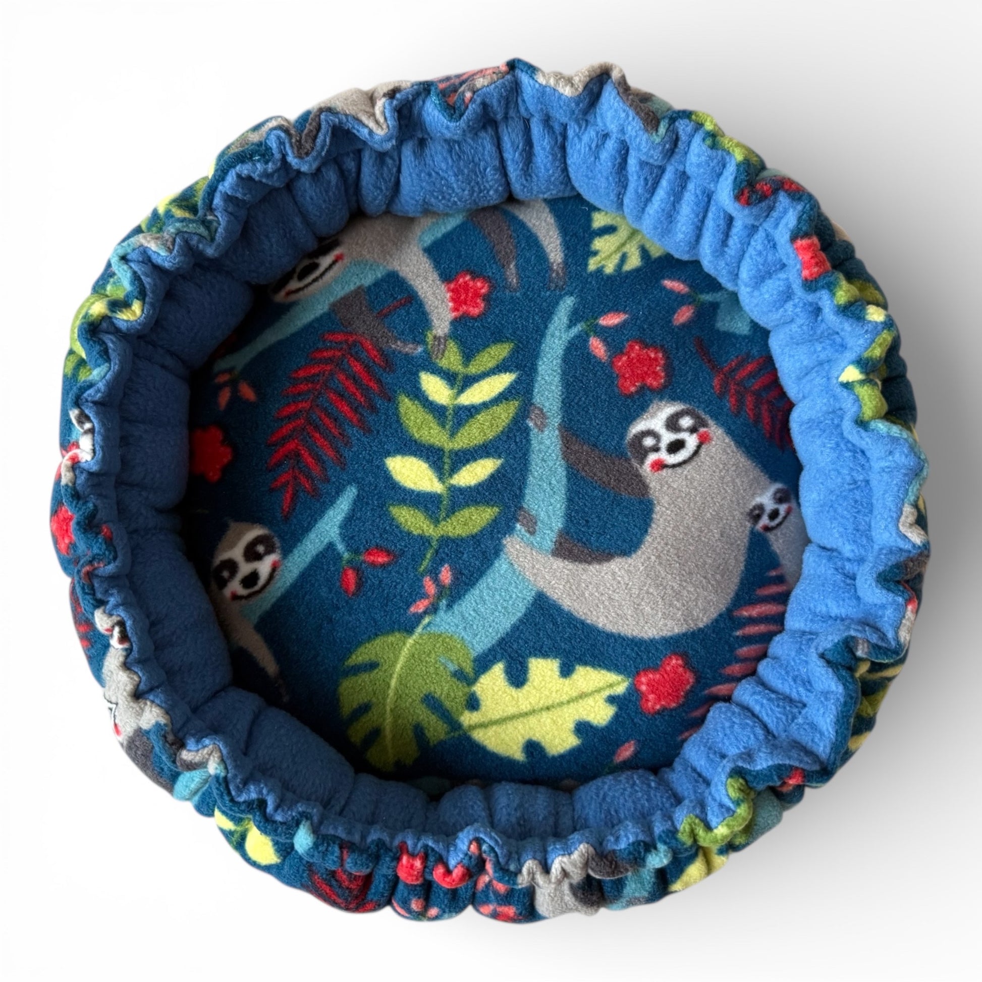 Šis guolis pagamintas iš mėlyno fliso su su tinginių raštu, todėl atrodo stilingai ir žaismingai. Pufas turi papildomą neperšlampamą sėdynę, todėl skalbti reikės tik ją, o ne visą guolį. Dvigubas dizainas (margintas ir vienspalvis flisas) puikiai tinka fotosesijoms arba pasikeitimui pagal nuotaiką.