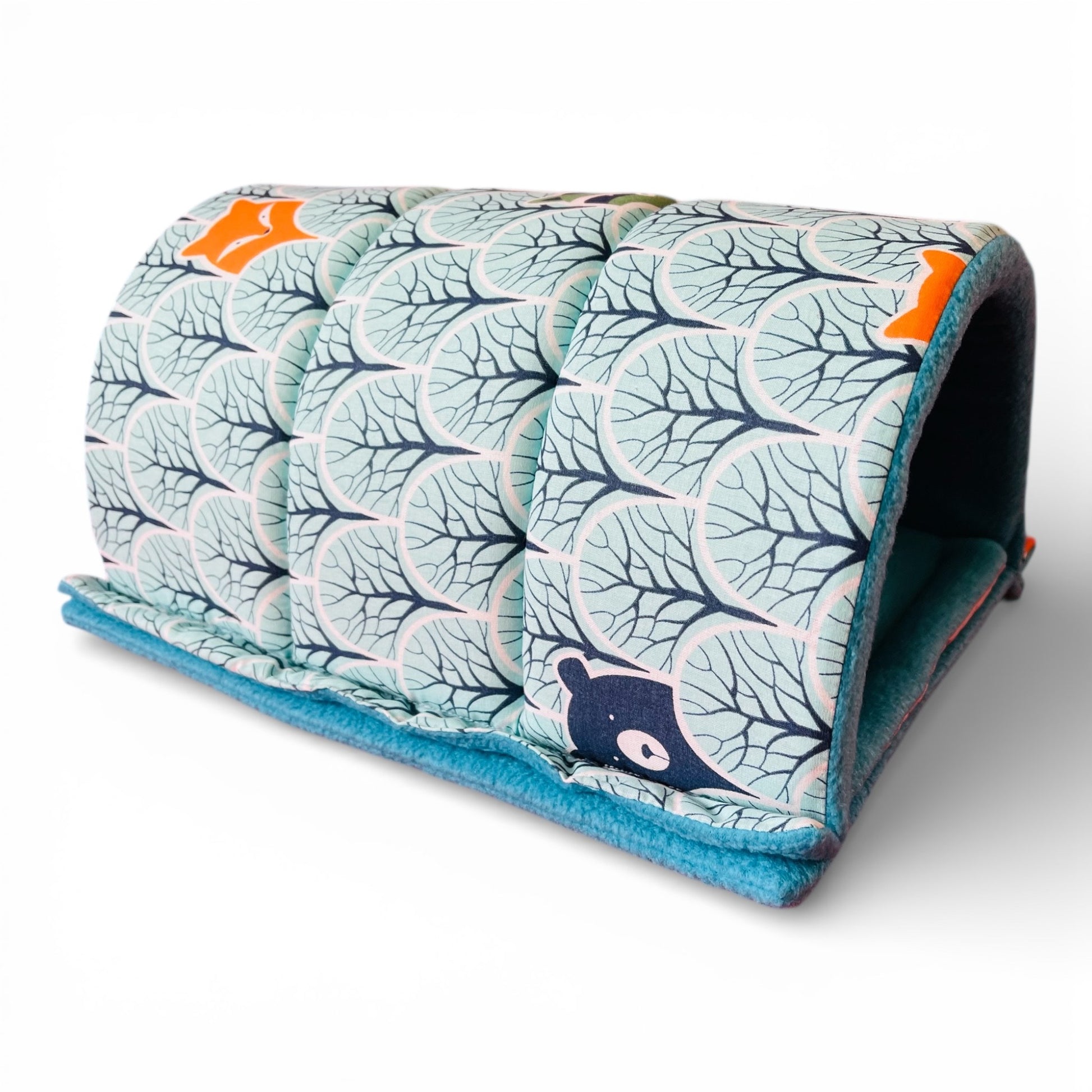 Šis Šiltnamio dizainas pasiūtas iš mėlyno fliso su miško rašto medvilne.