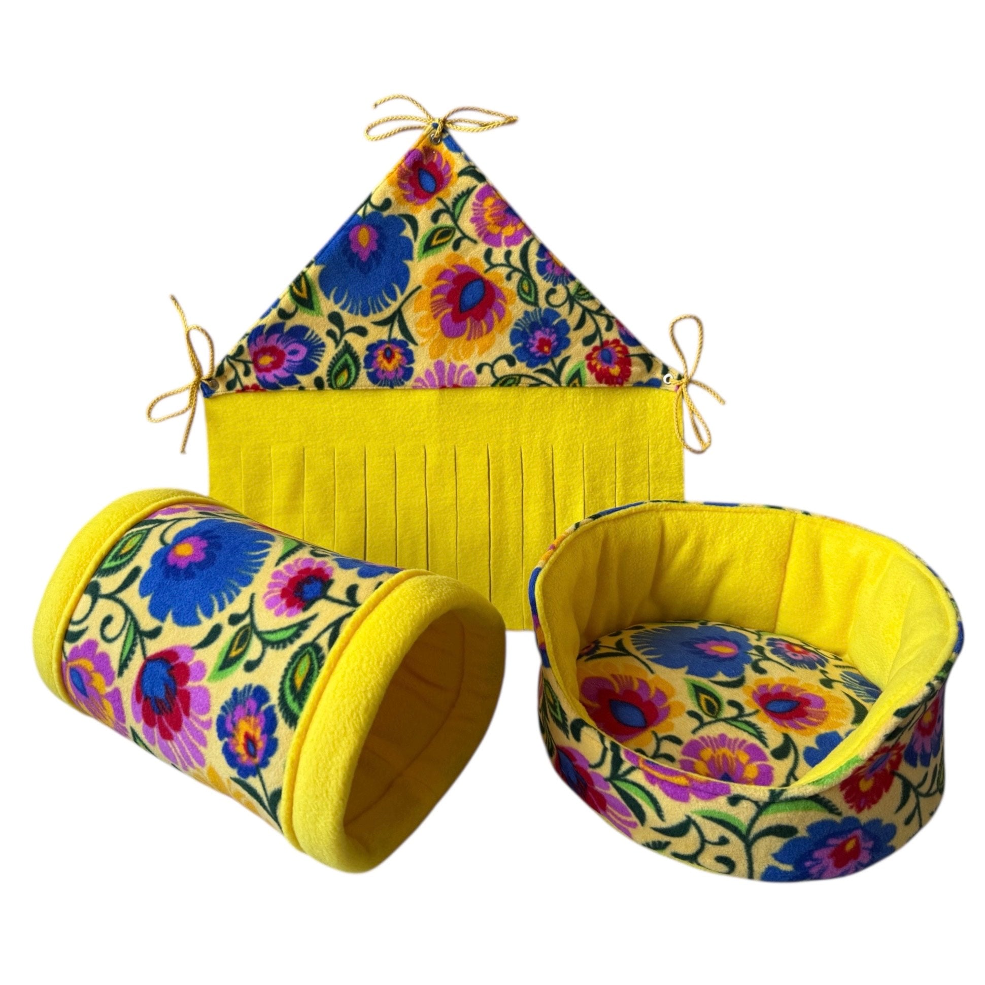 Komplektas jūrų kiaulytėms „Gėlės geltoname fone“ | Rankų darbo Lietuvoje